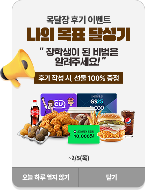 → Á¾ÇÕ¹Ý ´ë»ó ÀåÇбÝÀÎ 30¸¸¿ø Áö±Þ - ¨é µµÀü ½Ã¿¡ ¼±ÅÃÇÑ ¸ñÇ¥ Çб³¿¡ ÇÕ°ÝÇÑ °æ¿ì¿¡¸¸ ÀåÇÐ±Ý ´ë»óÀÚ¿¡ Æ÷ÇԵ˴ϴÙ.
